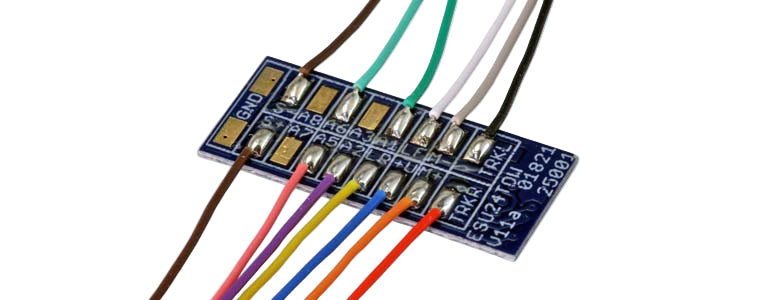 These two adapter boards are available for using the super compact E24 decoders in locomotives with a PluX16 interface (illustration) or for direct wiring.