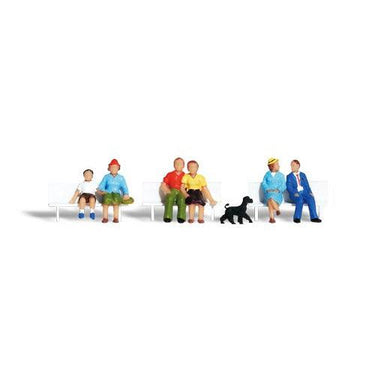 This set includes two men, three women, a child and a dog. A mother and her child wait, perhaps for a bus. A dog sits close by. A woman and man sit, engaged in conversation and another man and woman sit close together, just enjoying each other's company.