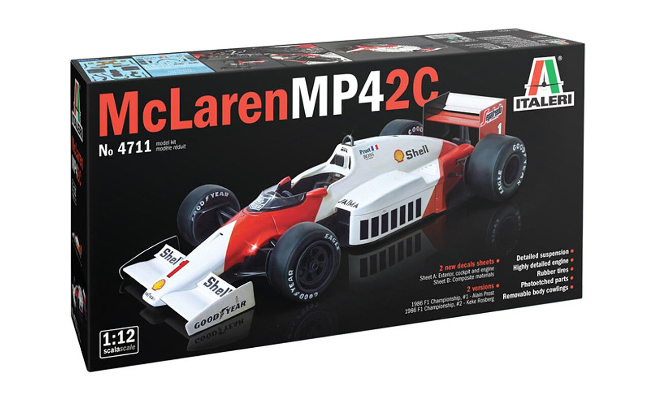 Detailed suspension - Highly detailed engine - Rubber tyres - Photoetched Parts - Removable body cowlings - 2 new decals sheet: Sheet A - Exterior, cockpit and engine. Sheet B - Composit materials - Decals for 2 versions: 1986 Campionship #1 Alain Prost - 1986 Campionship #2 Keke Rosberg