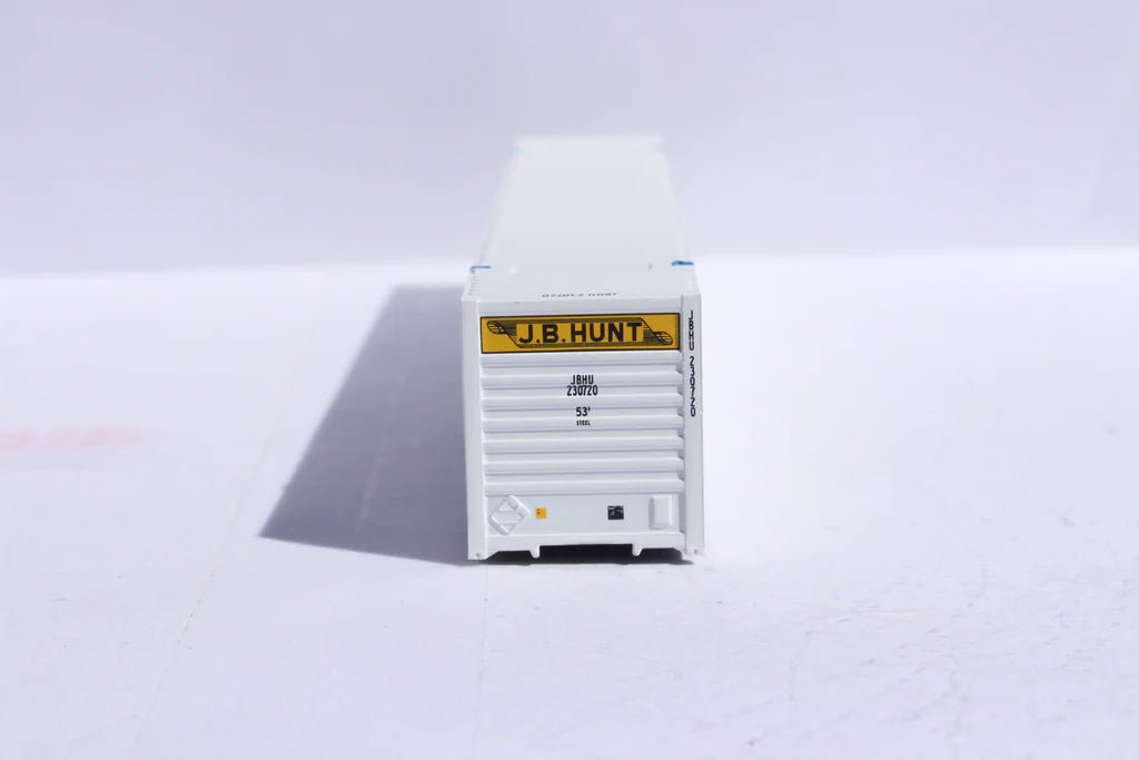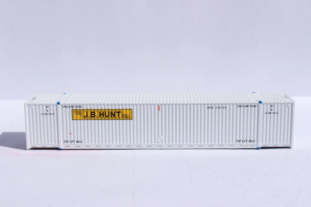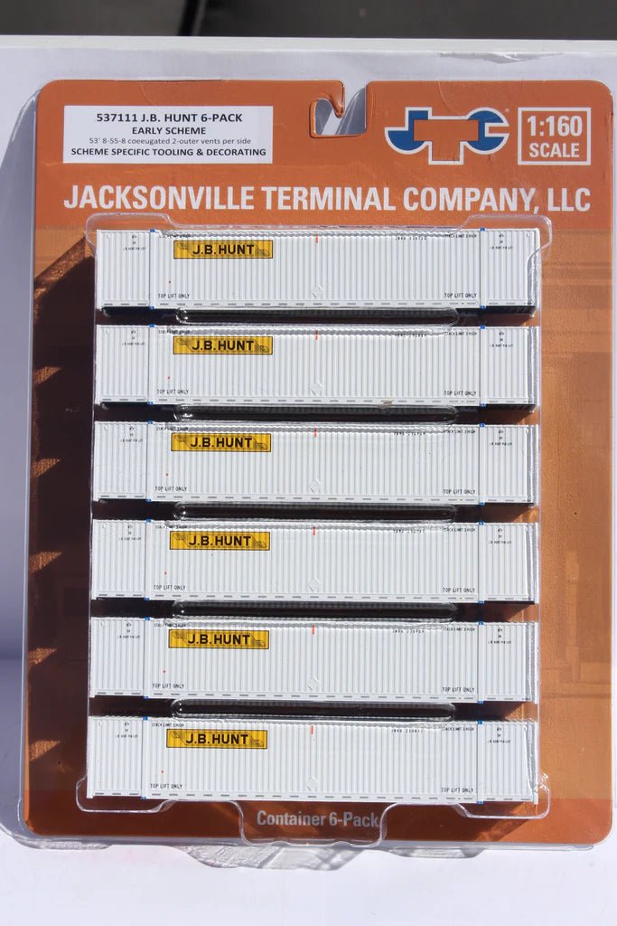 N Scale 1:160, JTC # 537111. - JB HUNT 6-pack - 53' HIGH CUBE 8-55-8 corrugated containers with stackable Magnetic system.  Scheme Specific Details and decorating. NEW SCHEME - This scheme has larger End logos, and No 'Intermodal' lettering. Early scheme.