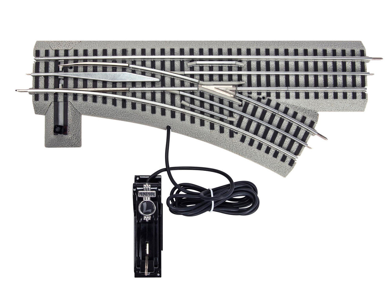 COMMAND SWITCH FASTRACK RIGHT HAND REMOTE SWITCH Flawless non-derailing function allows trains to keep running regardless of switch position Plug and play using track voltage or auxiliary power Auxiliary power and TMCC(tm) (ASC and SC-2) terminals are conveniently located under the roadbed base, making all connections invisible from above Realistic illuminated switch lantern Lantern base is interchangeable, can move to the right or left side PRODUCT SPECIFICATIONS Gauge: O Gauge Brand: Lionel Power: Electric Dimensions: Length: 15" Straight, 30-Degree turnout WARNING: CHOKING HAZARD - SMALL PARTS! NOT INTENDED FOR CHILDREN UNDER 3.