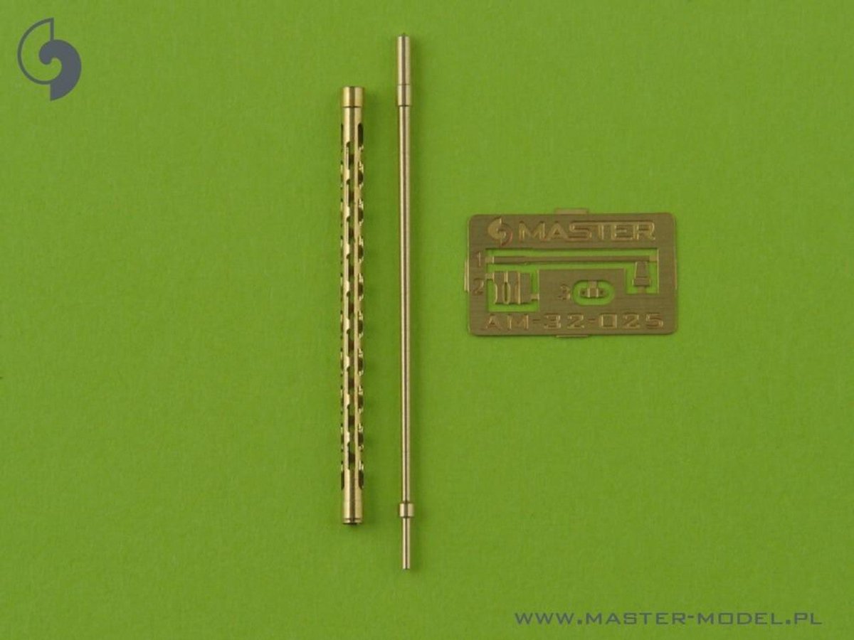The set includes one turned brass barrels with drilled cooling jacket. It is very simple to use in your model, and makes it extremely realistic. Simply cut off the original plastic barrel and drill a hole in the remaining plastic parts and insert the metal barrel using Cyanoacrylate adhesives. We advise soldering to join metal parts together.