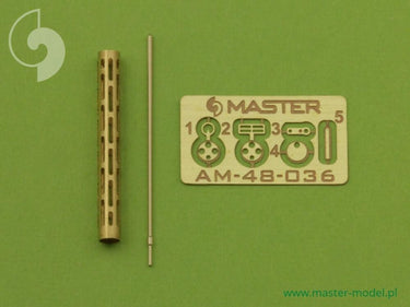 The set includes one turned brass barrels with drilled cooling jacket. It is very simple to use in your model, and makes it extremely realistic. Simply cut off the original plastic barrel and drill a hole in the remaining plastic parts and insert the metal barrel using Cyanoacrylate adhesives. We advise soldering to join metal parts together.