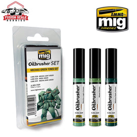 This unique range of Oilbrusher colors for painting and weathering offers the convenience and accuracy that you expect from AMMO by Mig Jimenez. This set contains three tones that will allow you to get the most realistic range of green toned effects on your models, making the choice of colors simple.Oilbrusher is the innovative oil paint with built-in applicator brush; this unique and practical AMMO feature ends the need to clean up messy oils after each use. The modern container also includes the dispenser–cleaner system which removes access paint from the brush. This revolutionary design saves both product and cost, while offering a clean and simple to use alternative to traditional oils which are both expensive and inconvenient.Oilbrushers are specifically formulated for modeling use. This means that your oils are diluted to the perfect consistency to be applied directly onto your model for a glaze free finish. No longer do you need to place the oil paint onto a pallet or piece of carboard when painting, eliminating time waisted preparing and cleaning.This set includes:A.MIG-3529 Mecha Green LightA.MIG-3530 Weed GreenA.MIG-3531 Mecha Dark Green