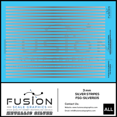 Fusion Scale Graphics is proud to officially announce our new line of metallic waterslide decals for modelers. With metallic gold and metallic silver printed at a stunning 2400x4800 DPI on our new dry ink system, you're sure to love the effects and the fine detail of these new prints with their true metallic shimmer.