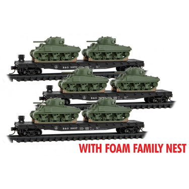 Micro Trains N Scale50' Flat Car w/ Sherman Tanks FOAM 3-PACK Baltimore & Ohio (B&O) 8937, 8943, 8952 Rel. 06/23