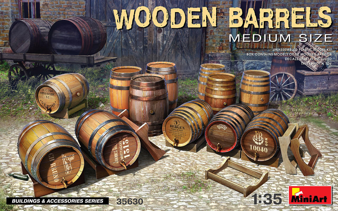 Unassembled Plastic Model KitBox contains models of 12 wooden barrelsDecal Sheet is Included