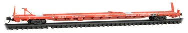 Built in 1978 by Pullman-Standard for Providence & Worcester, these 89’ flat cars with Barber Roller Bearing trucks were used for Trailer on Flat Car service through the 1980s. Providence & Worcester was founded in 1844, and in 1892, the New Haven leased the P&W for 99 years. When New Haven merged into Penn Central in the later 1960s, P&W was released from the lease deal and became a separate entity, and is now owned and operated by Genesee & Wyoming.