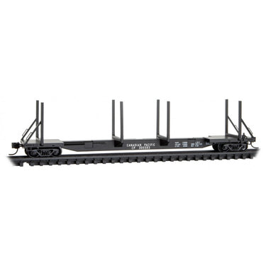 This skeleton log car with Barber Roller Bearing trucks was built for Canadian Pacific Railway in 1968, and belonged to a series of 25 cars. They were used to transport rough cut logs and finished power poles and features 4 rows of fixed bunks and a 170000-pound capacity.
