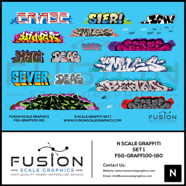 Graffiti decals work great on your freight cars, buildings and many other items across your layout. Our top of the line graffiti decals are printed with a white backing on a clear decal film, this white backing allows the decal to be placed over dark colors (including black). With the ability to print and control where white is printed our decals are not printed on a white decal film.