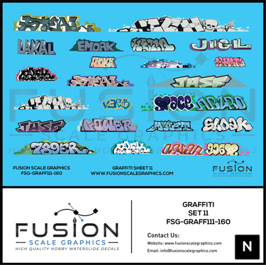 Graffiti decals work great on your freight cars, buildings and many other items across your layout. Our top of the line graffiti decals are printed with a white backing on a clear decal film, this white backing allows the decal to be placed over dark colors (including black). With the ability to print and control where white is printed our decals are not printed on a white decal film.
