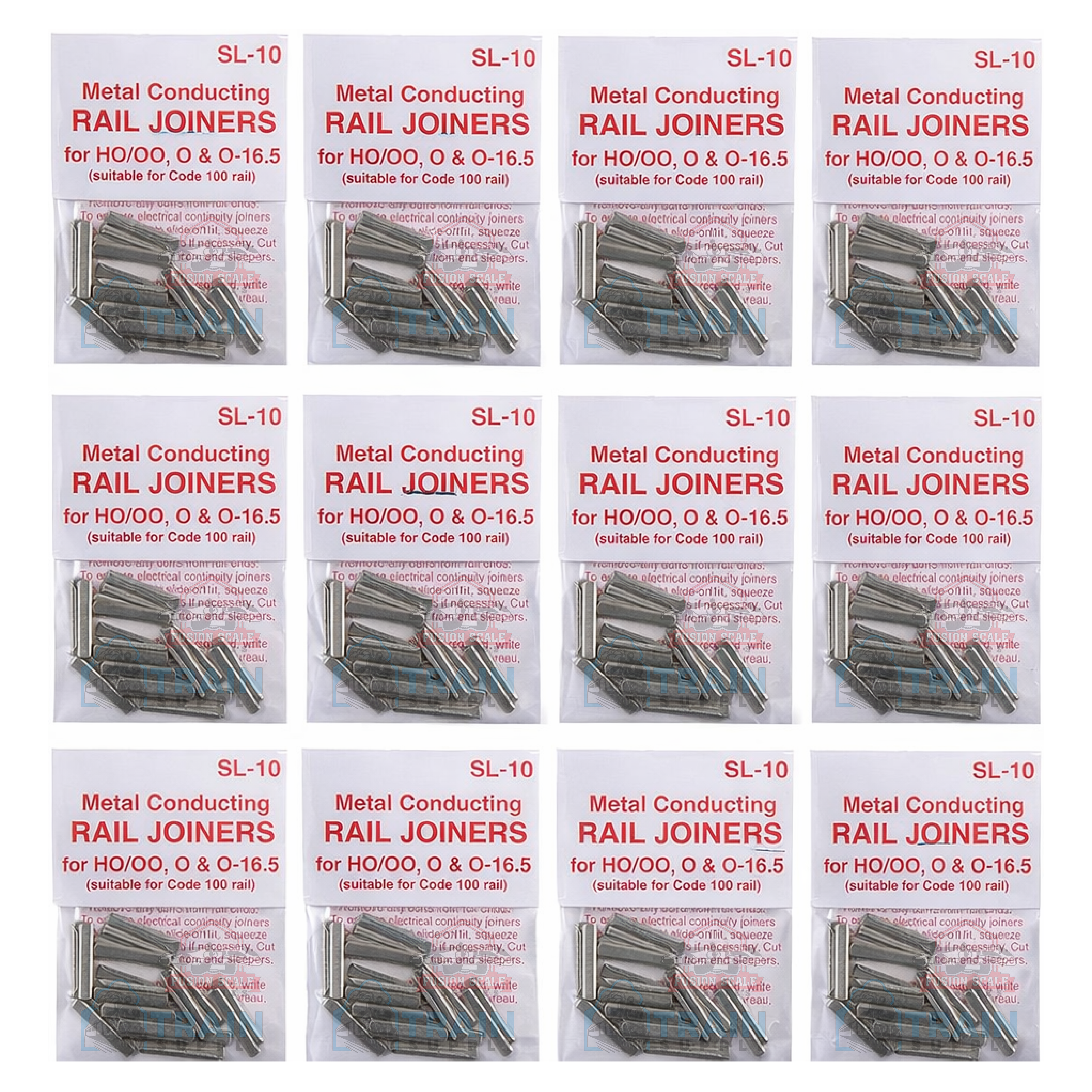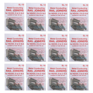 This listing includes 12 individual Peco SL-10 retail packs, with 24 rail joiners per pack, for a total of 288 nickel silver rail joiners.