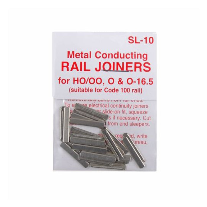 These genuine Peco SL-10 metal conducting rail joiners are designed to provide reliable electrical continuity and secure mechanical alignment for Code 100 rail. This listing includes 12 individual retail packs, each containing 24 nickel silver rail joiners, for a total of 288 joiners.