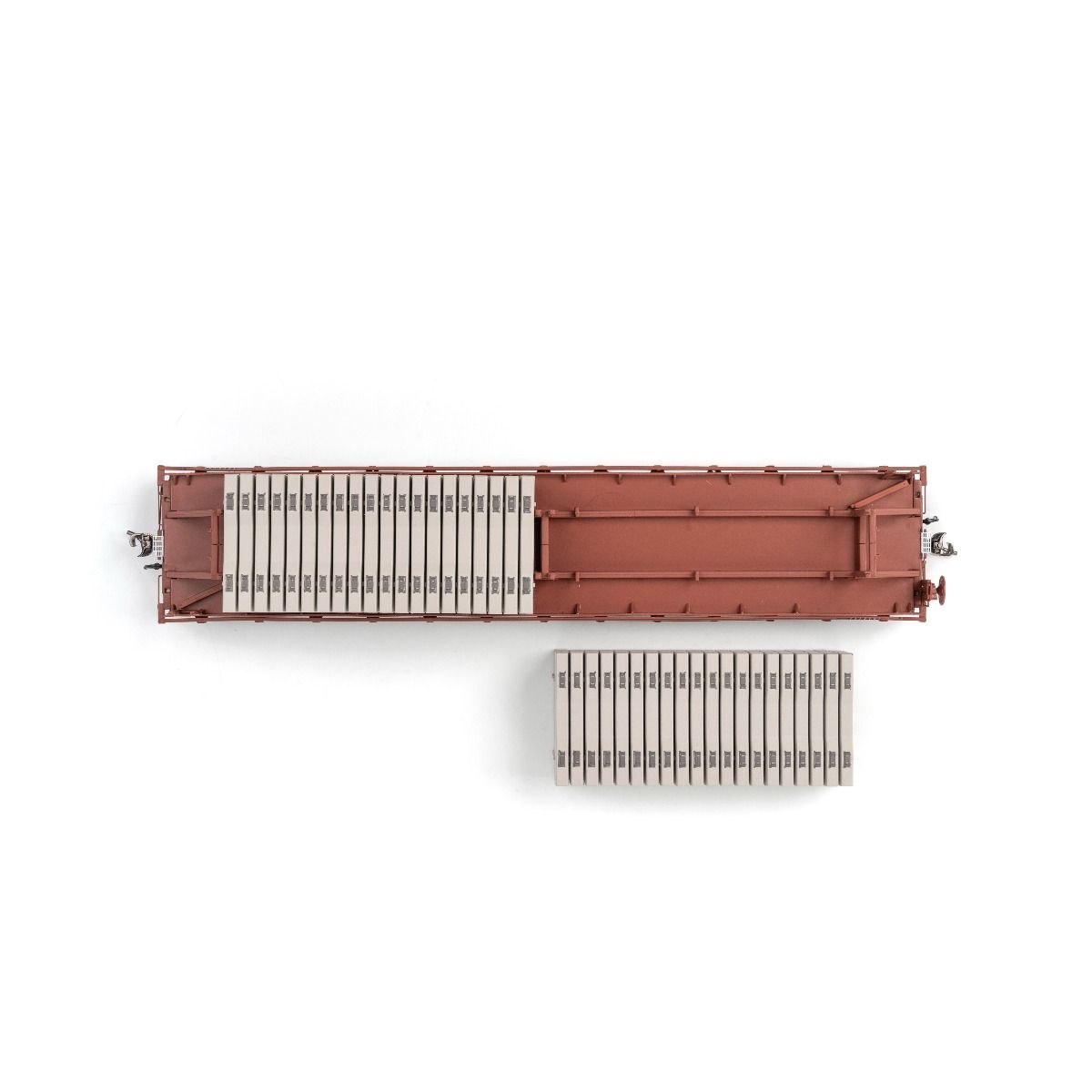 We are offering the F30 in several flavors: general service flat cars, piggyback flats with appropriate trailers, BNSF crosstie cars, and Conrail camp train work flats, complete with camp trailers!