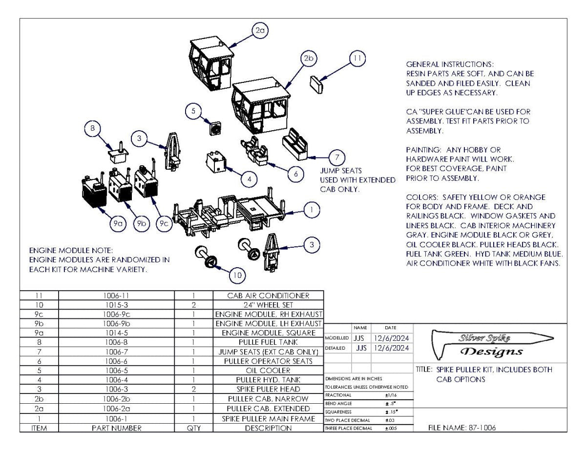Kit includes main frame, standard and extended cabs, engine, tanks, wheels, and accessories. Parts for One puller.