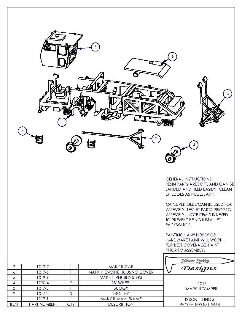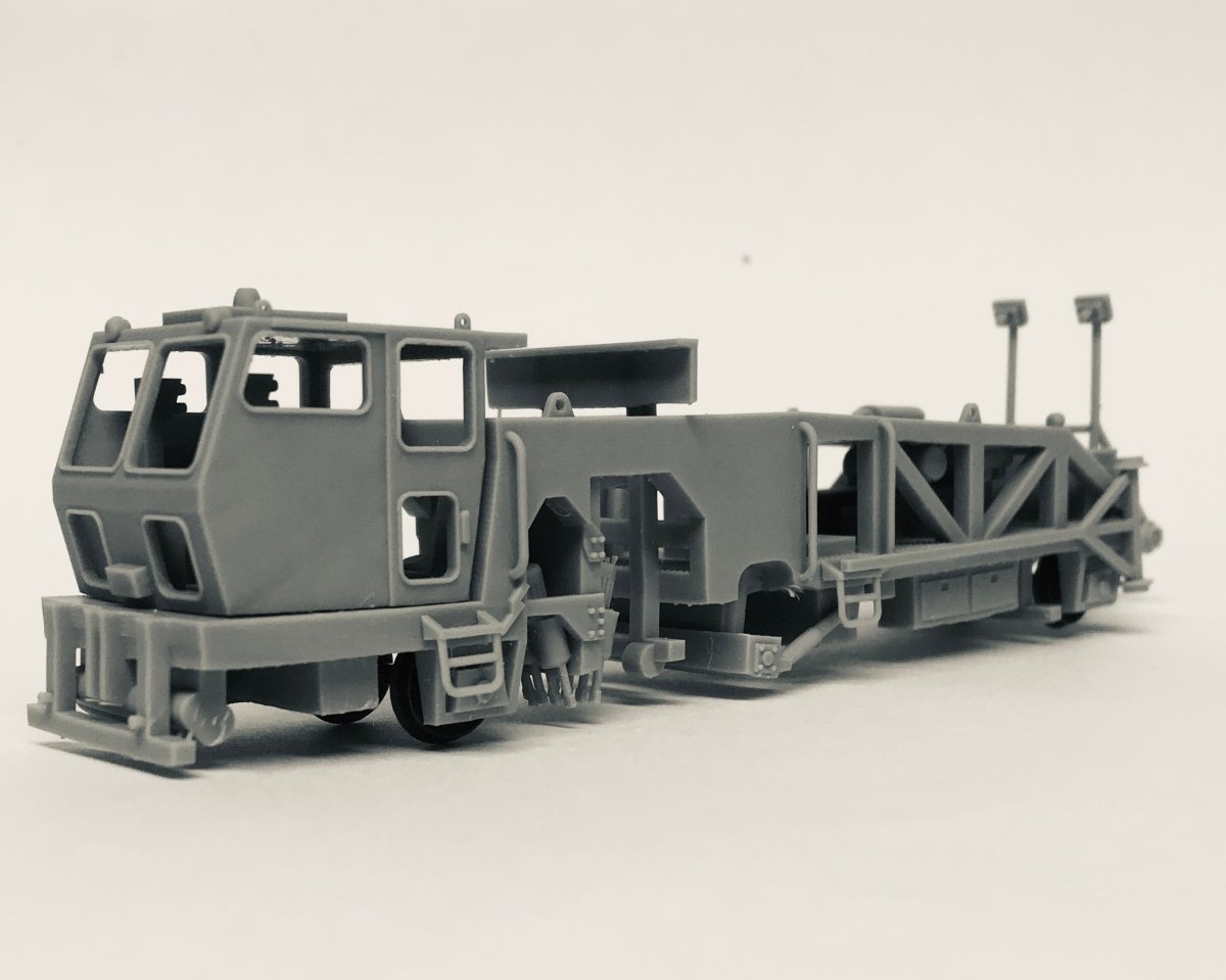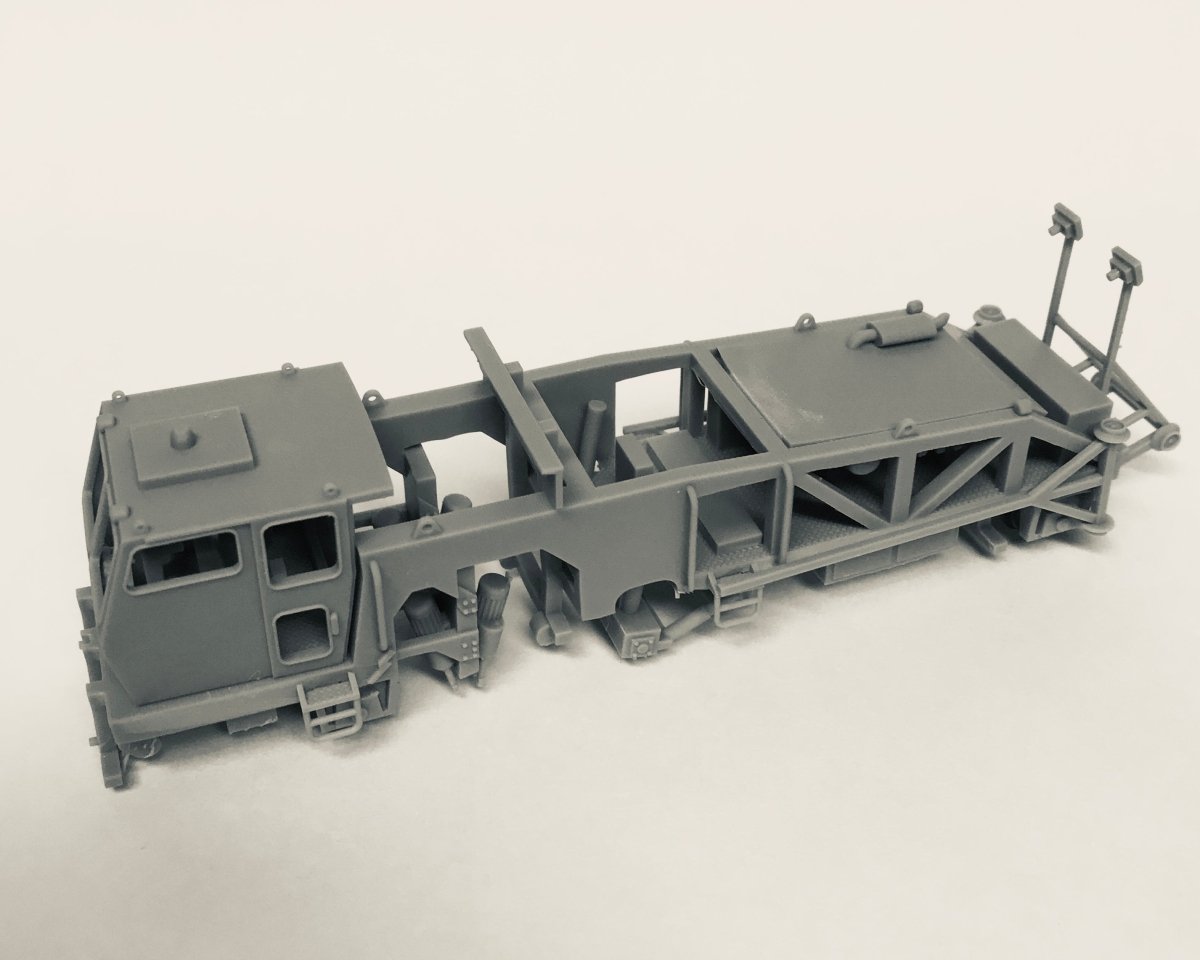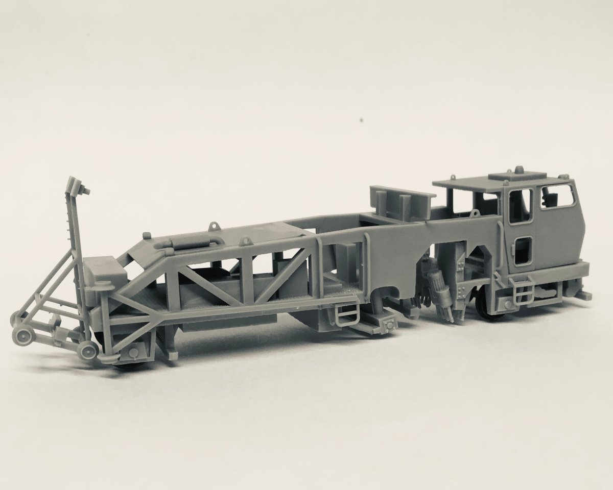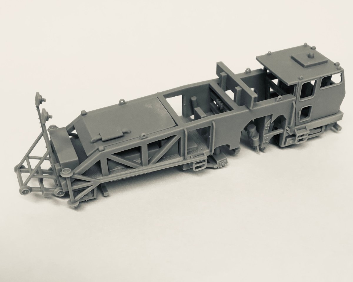 Kit includes main frame, cab, engine hood, steps and laser buggy. Builds one tamper. 3D printed 28" wheels included, or use standard 33" freight car wheel sets.