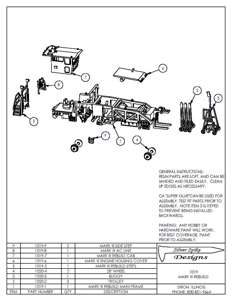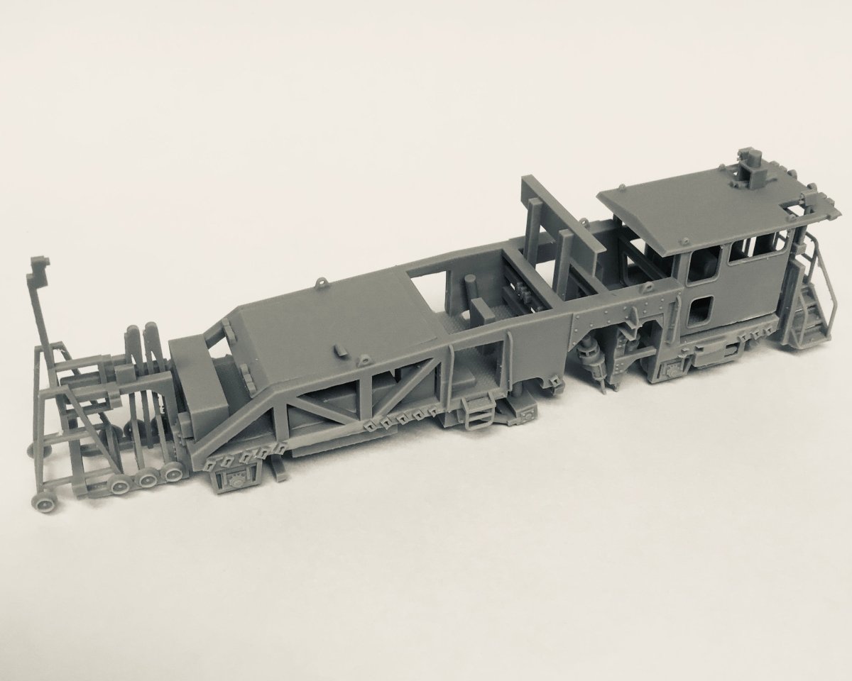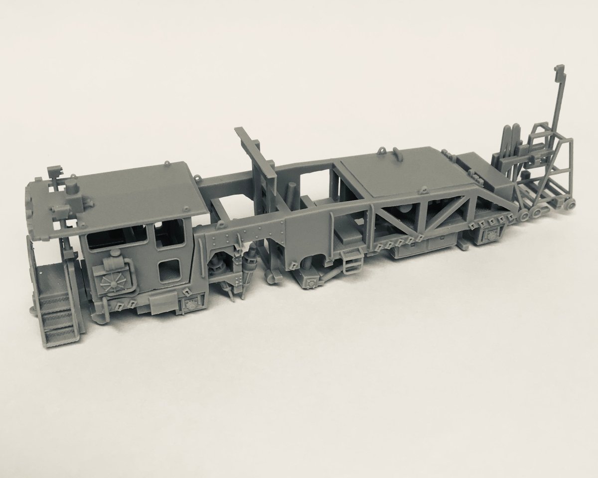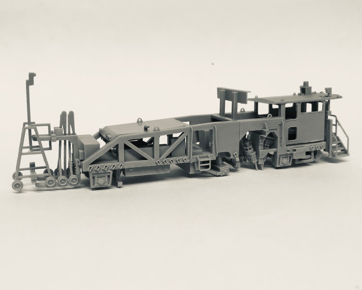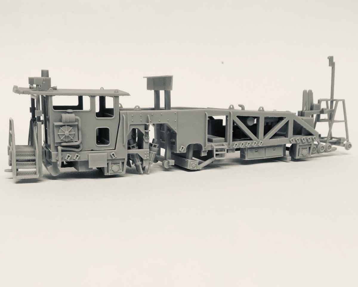 Kit includes main frame, cab, engine housing cover, step assembly, air conditioner, and laser buggy and carts.  Builds one tamper. 3D printed 28" wheels included, or use standard 33" freight car wheel sets.