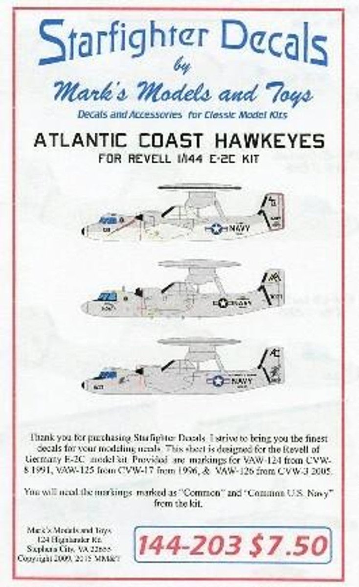 Printed by Cartograf of Italy.Sheet contains markings for 3 E-2Cs that served in Atlantic Fleet Air Wings.VAW-124 Bear Aces, CVW-8 USS Nimitz 1981 (New Artwork!)VAW-125 Tiger Tails, CVW-17 USS Enterprise, 1996. Has Nose art of a leaping tiger.VAW-126 Sea Hawks. CVW-3 USS Truman, 2005. CAG Bird.You need the kit markings for the National Insignia and aircraft data (on the kit decal sheet).Placement guide included