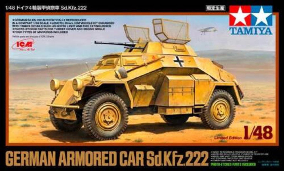 The 4x4 German armored car Sd.Kfz.222 was powered by a 80hp Horch V8 engine and came armed with a 20mm gun and a MG34 machine gun. From 1936 to 1943 (including all versions) approximately 990 were manufactured and were eyes of the Panzer divisions as they were mostly used as a reconnaissance vehicle throughout Europe and North Africa. This set has been built in co-operation with ICM. A great thing of this model Armored Car which was peculiar to the German Army is the ease of its assembly as well as the accuracy of the body. Photo-etched parts for the hand grenade protector net and the grille above the engine are included. One sprue from Tamiya"s 1/48 Panzer III/ IV tank is supplied allowing the modeler to freely add detailing such as the notek light, shovel, and fire extinguisher. Both the packaging and the instruction manual are Tamiya made. There are four markings for the North African and Russian front (2 each).