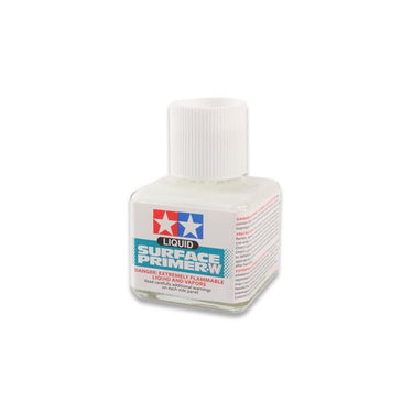 Tamiya's Liquid Surface Primer is perfect for smoothing over small scratches, holes, and gaps, and can be easily applied with a modeling brush. Furthermore, it can be thinned using separately available Tamiya Lacquer Thinner and applied with an airbrush, making this a very versatile tool for craft and hobby use. White color means it will not interfere with light colored paint finishes. Comes in a 40ml glass bottle.