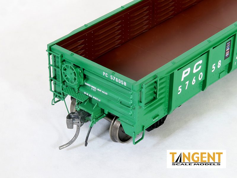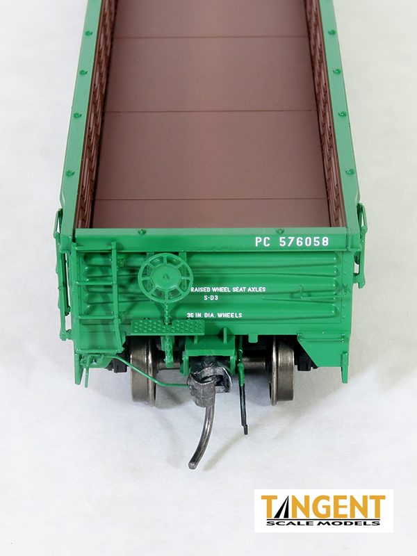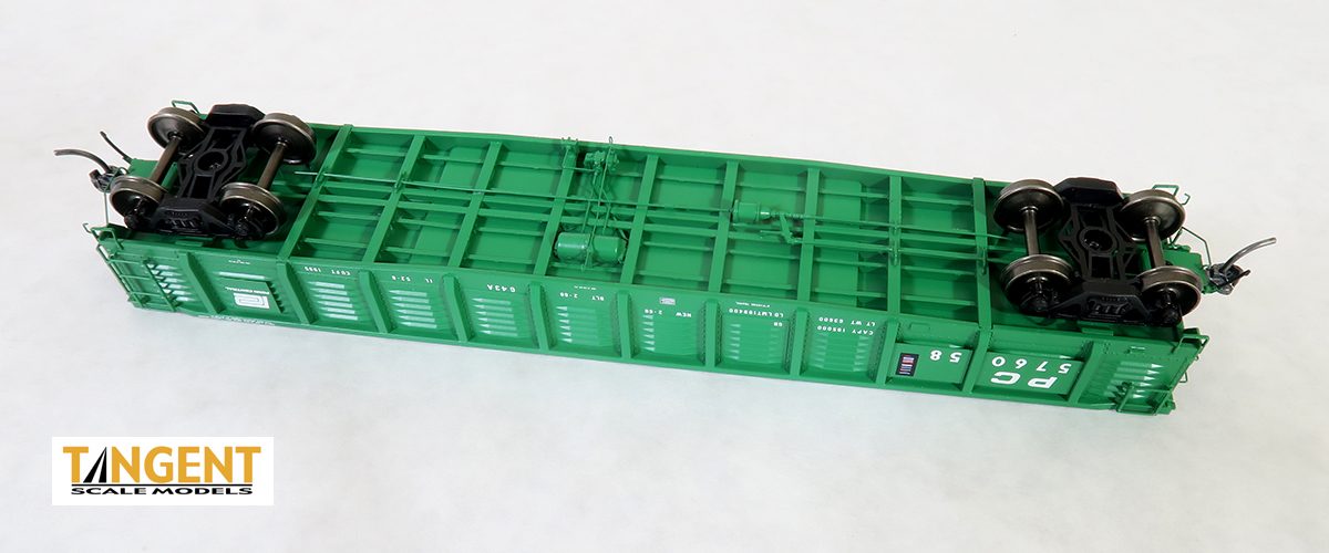 PC “Delivery G43A 2-1968” in the original Penn Central green paint scheme, and a PC version we have not yet offered! These gorgeous models have 2 placards in place for the PC reporting marks, road numbers, and ACI label on the left side of the car. On the right side is an additional placard that includes a PC logo and Penn Central lettering. These placards are utilized on this class of PC car since these cars have side corrugations on each panel, where they knew that putting paint on the corrugations would not last very long! These cars have corrugated ends, and the Tangent replica includes oxide red car interiors – on the interior walls and ends – like the prototype. We even duplicated the slight green overspray on the inside end corners! The 100-Ton trucks feature accurate rotating “Timken” caps.