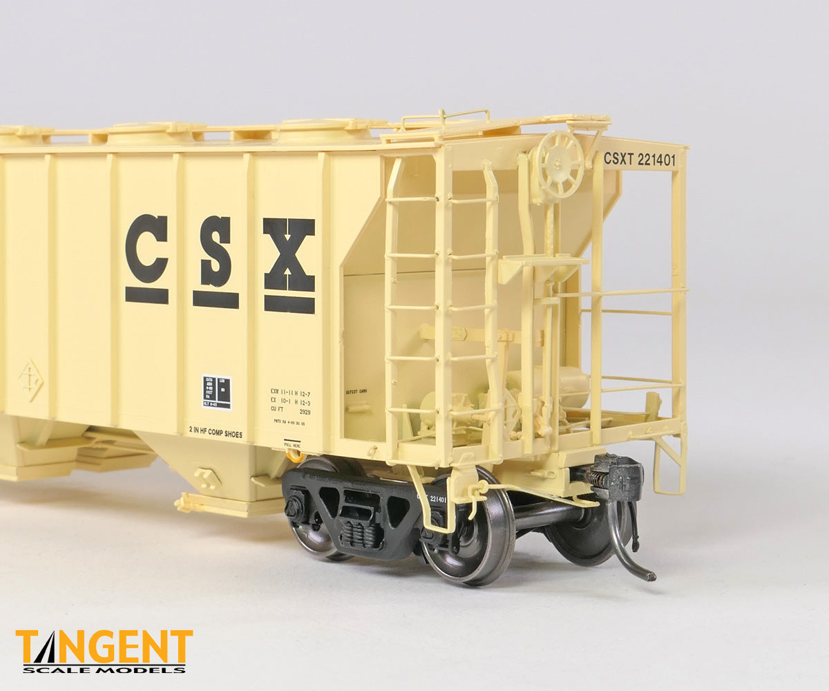 – CSX “Repaint 1989” shows off the very common and consistent CSX repaints from the 1989-era, and takes us all back to the early days of CSX freight car repaints. This group of PS 2929 cars is pulled from the ex-ACL series and features record-specific CSX Raceland Shops repaint dates and data. The models feature correct ex-ACL roof details like a see-through Apex-style running board and evenly-spaced round roof hatches. In this era, the retainer valve has been moved to a lower location, a feature carefully duplicated on the models. The gravity outlet gates are specific for CSX and are a replacement style with locking bar mechanisms. The prototype CSX repaints maintained the distinctive ex-ACL 100-Ton trucks with the retaining bolts detail. The B-end of the car features all of the brake details and piping of the prototype, including a gorgeous Ajax brake stand, modern brake wheel, Morton-style brake step, wire piping details and a finely executed air release rod poking through the bottom sill on each side of the carbody. Metal corner stirrup steps and flexible rubber air hoses on each end of the car provide durability.