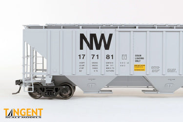 – NW “Delivery HC-71 1973” shows off the classic NW delivery gray paint.  Roanoke built this group of 1000 cars across 1973-1974.  The car numbers are selected from August and September 1973 Roanoke production, with ribbed roof hatches and Keystone Portloc outlet gates.  It’s hard to understate the importance of these cars for modelers of the last 50+ years.  Check out that Roanoke-style 4750 body construction, including two vertical rows of huck bolts on the car sides, wider post flanges and slot-style jacking pads above the bolsters.  The shaker brackets on the bays are mounted higher than their Pullman Standard-built peers.  Yes, we tooled an all-new body to cover these details and more!  The paint details stand out, with the classic yellow N&W return route box under the “Grain Loading Only” lettering.  The centersill of the car even features the tiny car number and Roanoke paint code stencil!  We duplicated the slight spacing variations on the one-inch CLOSE HIOPPER SLIDES stencils across these car numbers.  Eagle-eyed modelers will notice the Tangent model’s A-B-C bay stencils are accurately applied with the “C” bay at the B-end of the car.  This was just the N&W’s way of doing things.  (Pullman typically labeled the “B” Bay to the B end of their cars!)  The car sides have an ACI label mounted on a raised plate, matching the prototype.  The accurate 100-Ton Barber S-2 Roller Bearing Trucks feature tiny N&W-applied T-188 truck class stencils, rotating Brenco-6 caps and 36” all-metal wheels.  We are proud to offer these NW replicas in 12 road numbers: SKUs -01 through -08 feature 8-1973 build dates while SKUs -09 through -12 have 9-1973 build dates.