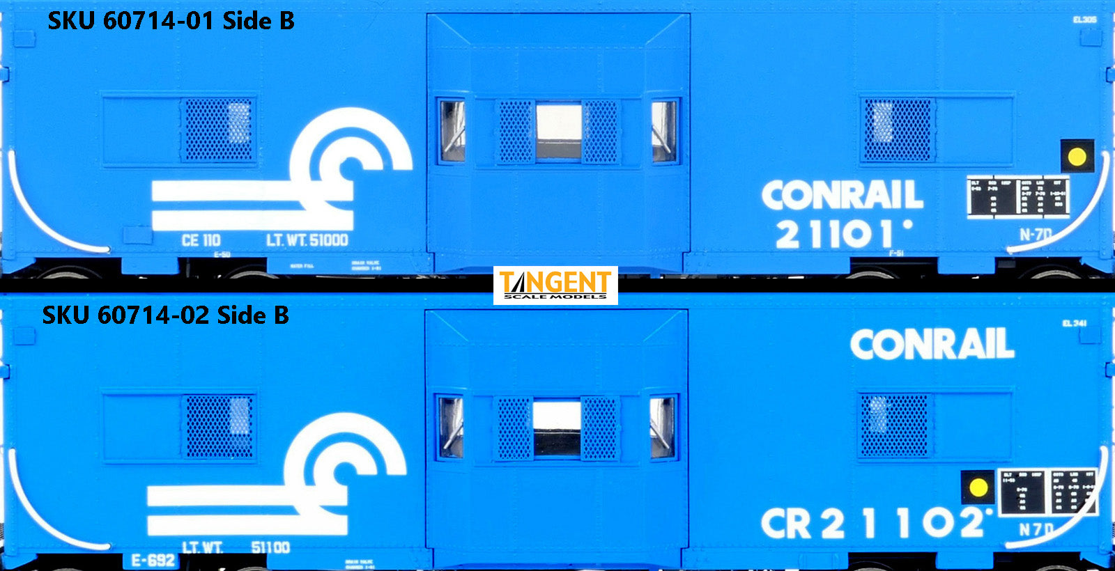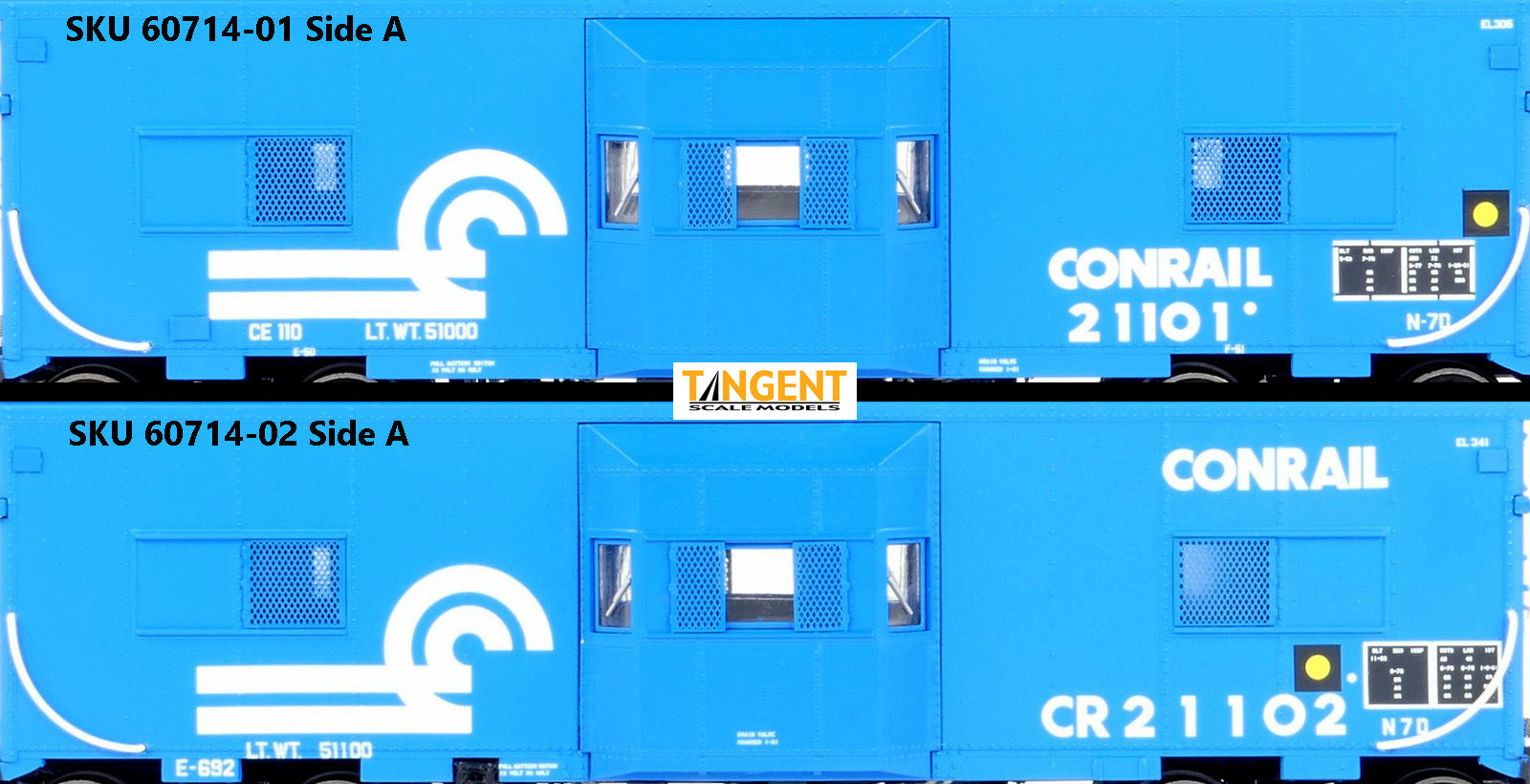 – Conrail N7D “Blue Repaint 1981+ Era” w/ Interior Lights and Lit FRA Flasher gives 1981+ CR modelers an accurate caboose option.  These models match Conrail’s modifications to the roof and ends.  The roof has been simplified: the walkway has been removed, but the support brackets remain.  The antenna ground plane is also gone by this era, and the cabooses have replacement smoke jacks.  The ends were rebuilt to match the sister N7 ex PC/NYC class and include the installation of the FRA flashing end light.  (Yes, it’s ORANGE per CR practice!)  If you look at the one end, you will even notice the window is gone, replaced by a fuel fill pipe.  This corresponds to the removal of the coal stove and changeover to an oil bunker and CABAN oil heater.  The side marker lights are plated over.  Under the caboose, Conrail replaced the large generator with their standard DAYCO belt drive.  The battery box is also gone.  The trucks have been changed to 70-Ton Barber Roller Bearing Caboose Trucks.  The paint scheme features the shorter CR logo with CONRAIL and car number on the side, along with era accurate COTS and U-1 inspection dots.  If you look carefully in the upper right corner, you can spot the former EL car number, carefully recorded in white stencil paint.  The FRA end flasher application, along with these detail and lettering features, combine to accurately execute a 1981+ era Conrail caboose.  For lighting, these Tangent CR 1981+ era cabooses are equipped with “golden” interior lights, mimicking the incandescent bulbs of the real cabooses along with flashing (orange) end FRA lights.  A wand is included to operate the lights – easy with no fuss!   We are offering our CR “Blue Repaint 1981+ Era” scheme in 2 exact numbers.  Each car number is photo-matched, so the details like the body sill notches, smoke jacks and specific CR lettering placement are accurate!