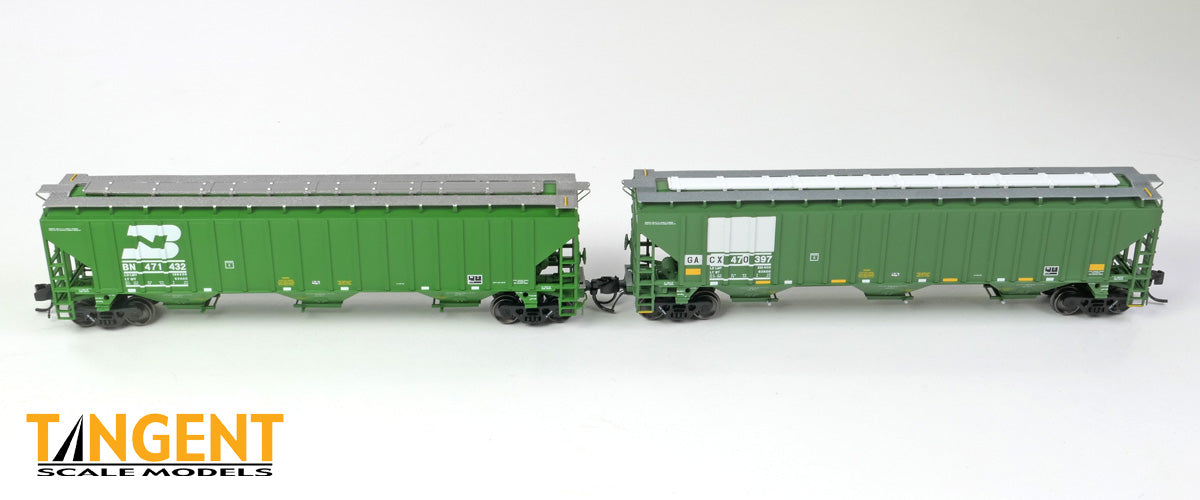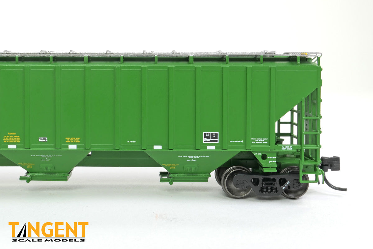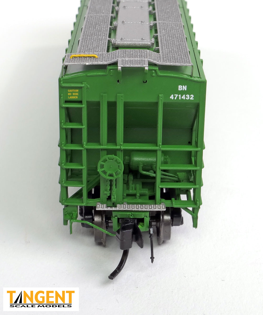 – Burlington Northern (BN) “Delivery Cascade Green 9-1994” continues our tradition of offering gorgeous BN models, and this is perhaps the most desired of them all! These cars are from the fifth 1,000 car group of the 6,000 BN-ordered Trinity 4750s. These cars came from Trinity in the “3 line” BN scheme with the smaller BN logo, all justified to the left side of the car. While most of the stenciling is sharp white paint against the Cascade Green carbody color, there are yellow caution lettering stenciling blocks on the sides and ends. These cars feature the “bolt on” outlet gate design that was found on some of the Trinity 4750 prototypes. Up on the roof of the cars are unpainted galvanized “slope up” Morton-design running boards and the galvanized steel trough hatches that Trinity applied are replicated on our model. Every railroad had different hatches, and BN is no exception, with multiple hatch types across orders – and within each order! The ends of the cars include a new-design brake reservoir, straight-handle coupler lift bars, separate brake wheel, etch metal Morton crossover platforms, and flexible rubber trainline air hoses! Underneath the cars, the centersill dividers have access holes in them like they should. These cars carrying this BN paint scheme were the capstone freight car of the Burlington Northern era. They were the largest fleet of cars ever to wear Cascade Green Burlington Northern paint, and they exemplified the early 1990s BN era. These cars were seemingly everywhere, and some of the fleet remains in service today in their original BN green paint, operating within the large BNSF covered hopper fleet. Oh, and just one more thing: BN was the largest purchaser of Trinity 4750s. These stunners are now available.