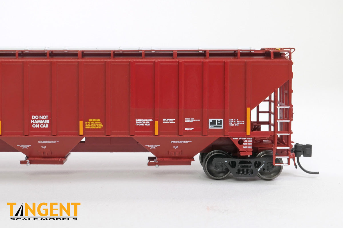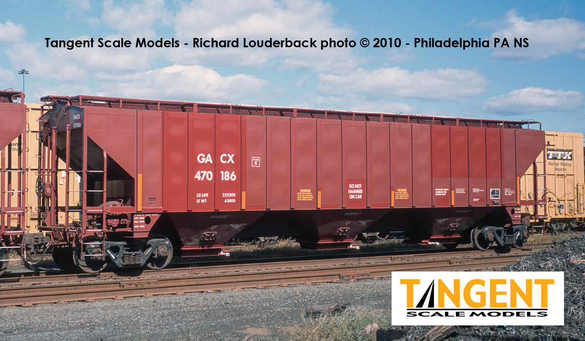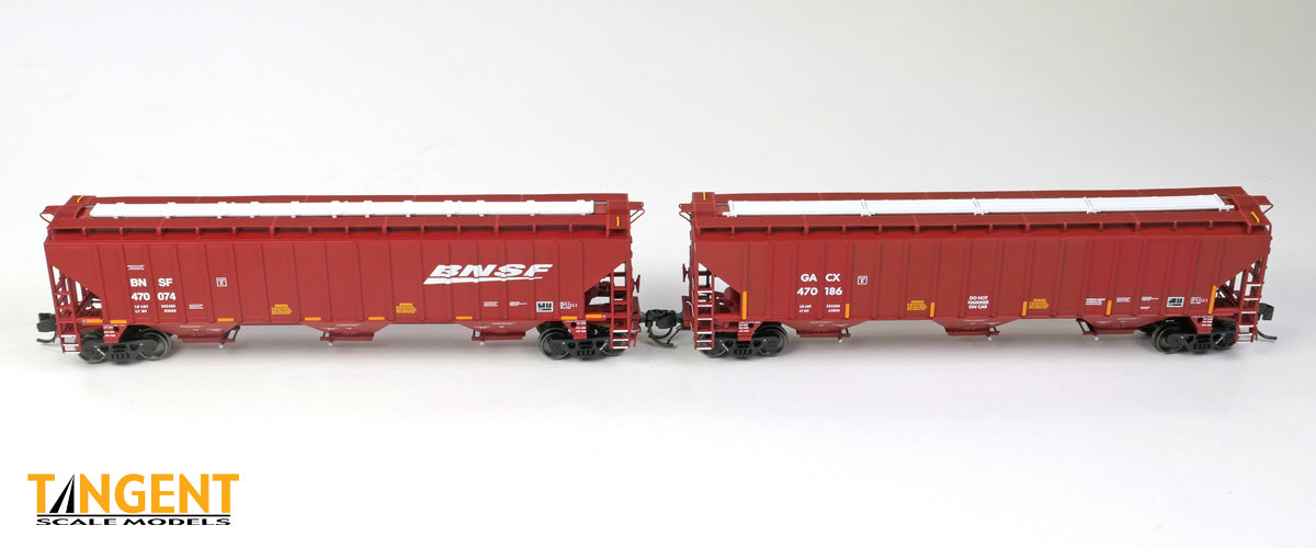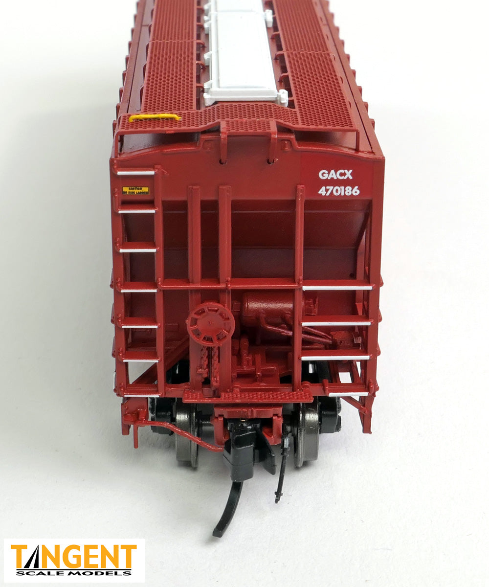 – GACX “BNSF Patch 2010” is one of two BN/BNSF patch-out offerings in this run of Trinity 4750s and are in general lease service. These cars are former BNSF swoosh cars that were patched out. These models are interesting because they mimic GATX’s patching of the BNSF reporting marks and logos, however they retain most of the other data. We offer a muted carbody color and a fresh paint patch out. We also mimic GATX’s treatment of the grab irons, where they painted the grab irons on the sides and ends of the car white in a nod to rail employee safety. These cars are formerly BN cars built in 1994. These cars have the “bolt on” outlet gate design that was found on some of the Trinity 4750 prototypes. Up on the roof of the cars is a carbody red painted galvanized “slope up” Morton-design running board, and the fiberglass trough hatches that BNSF applied are replicated on our model. The ends of the cars include straight-handle coupler lift bars, separate brake wheel, etch metal Morton crossover platforms, and flexible rubber trainline air hoses, all of which are accurately modeled on our Tangent replicas. These stunners are now available. Don’t miss out on these or on our GACX “BN Patch 2010 cars – they go together!