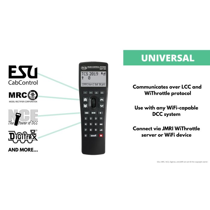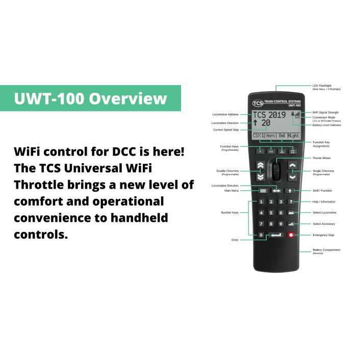 The UWT-100 Universal WiFi Throttle from TCS is the new standard in WiFi control for model railroads. This throttle brings a new level of ergonomic comfort and operational convenience to handheld controls. Instead of spending time with your head in a manual trying to understand your throttle, the intuitive interface of the UWT-100 allows you to focus on the important things - operating and enjoying your trains!