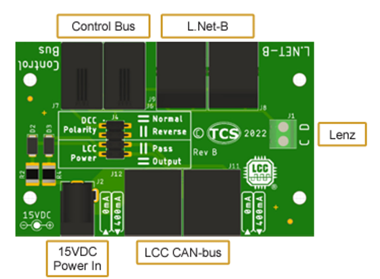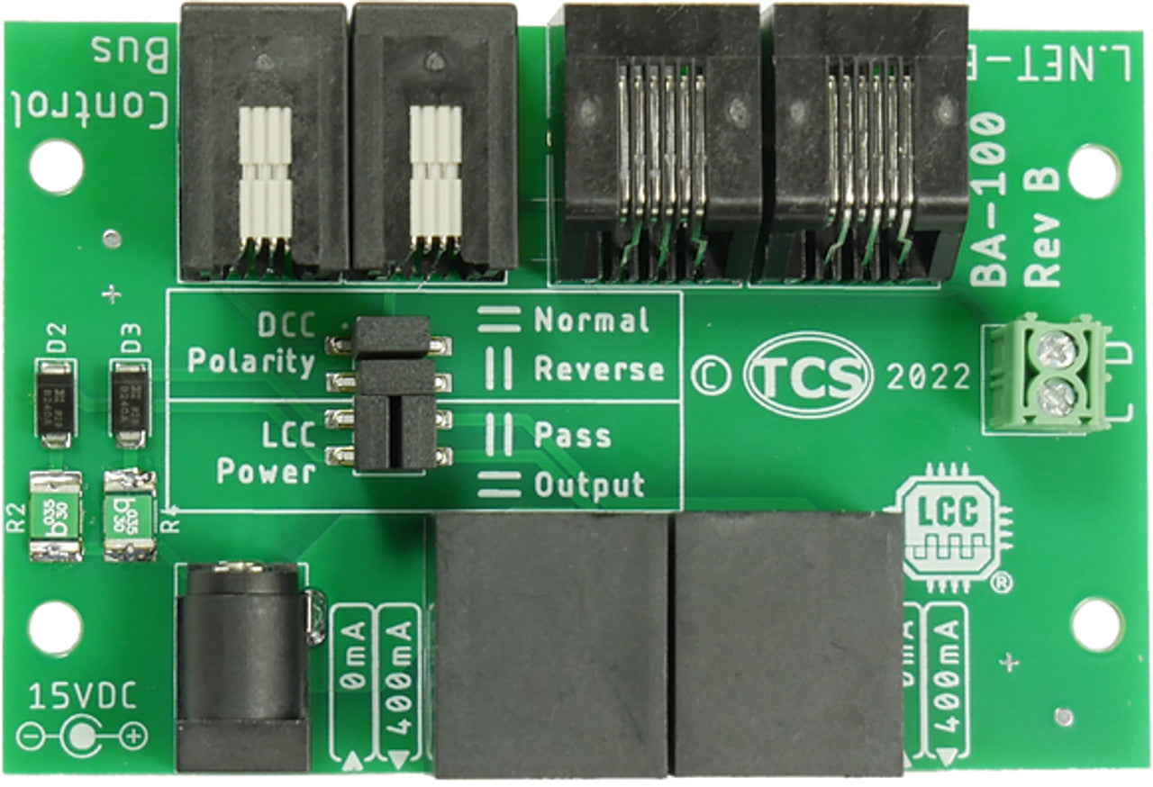 The TCS BA-100 can also provide power for other LCC devices distributed around your layout using the on-board barrel jack and an external 15V power supply (not included).
