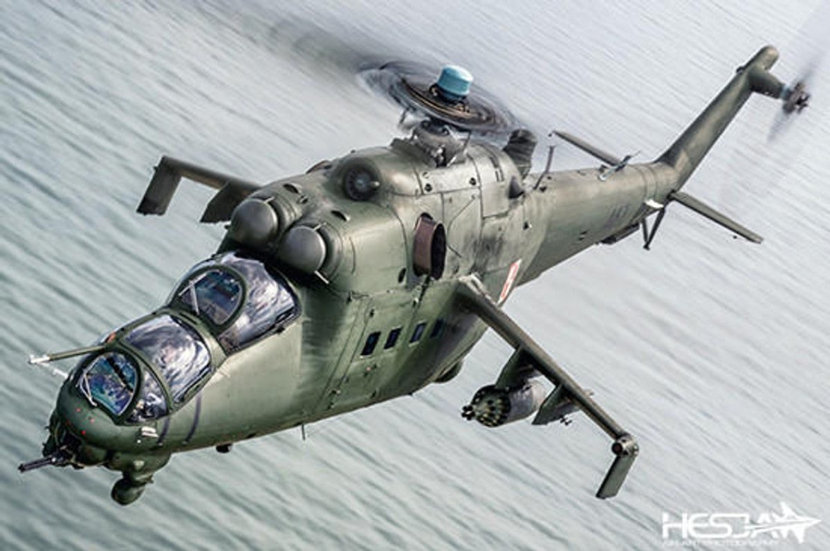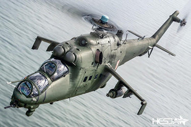 Mi-24V / Mi-35 "Hind E" Mi-24V (Hind-E) is another improved version, a development of Mi-24D. The major change consists in the upgraded and more efficient SHTURM - V missile system with 9M114 (AT-6 Spiral) radio-guided anti-tank missiles launched from two pairs of cylindrical pods mounted on wingtips. Also added were B-8V rocket pods for 20 80 mm S-8 rockets, UPK-23-250 pods with two-barrel Gsh-23L and 250 rounds, GUV9A universal pods which can carry a 30 mm 9-A-800 automatic grenade launcher, or one 12.7 mm 9-A-624 four-barrel machine gun and two four-barrel 7.62 mm 9-A-622 machine guns. It was equipped with TV3-117V engines with improved height characteristics and optional exhaust mixer boxes to cool exhaust gasses, and auxiliary fuel tanks with a capacity of 450 litres. Since the War in Afghanistan, Mi-24Vs received radar homing and warning system (RHAWS), infra-red countermeasures (IRCM) and an active IRCM jammer. These equipments were also fitted to some late Mi-24Ds, which have sometimes been refered to as Hind Ds Mod. The degraded version exported outside the Warsaw Pact was called Mi-35.