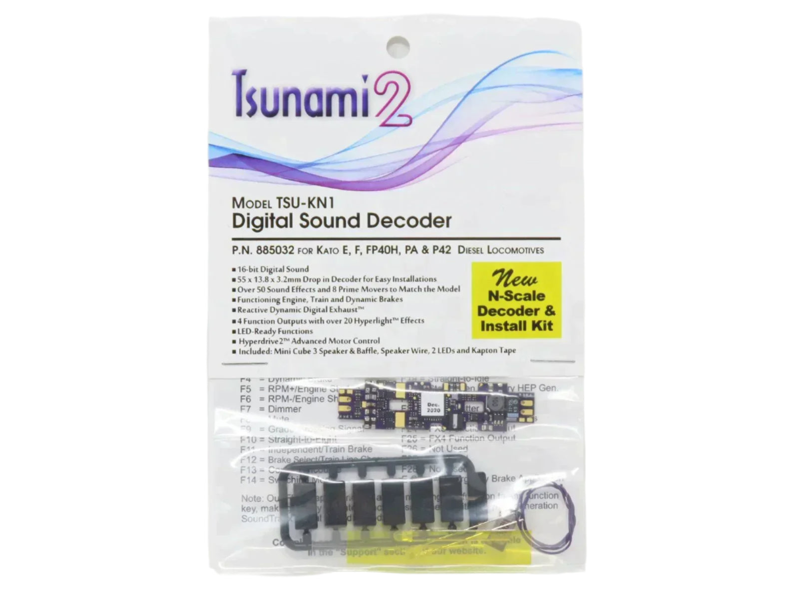 Tsunami2 meets N-Scale! The TSU-KN1 is our first plug-and-play Tsunami2 N-Scale decoder and installation kit. Finally, you can get the Tsunami2 features you have been wanting in your N-Scale locomotives! The new TSU-KN1 is designed to fit into Kato N-Scale E, F-units, F40PH, PA and P42 locomotives. Get an easy install and the amazingly realistic sounds plus the features that all Tsunami2 decoders have to offer.