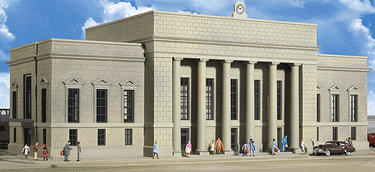 For generations of travelers, Union Station was the magical gateway to and from the world. The Walthers Cornerstone Union Station will be the gateway to your layout! Here is where the journeys of the finest trains on the line started and ended. Where travelers rushed to make their connections. And thousands of commuters began and ended their workday. Where space was limited in larger towns and cities, two or more railroads would often combine their resources to build and operate major terminal stations. Monuments to the power and success of railroading, they also projected the spirit of the community they served and the promise of excellent service for anyone who traveled by train. Union Station is a fitting tribute to the grand terminals that served railroading for over 100 years. Whether your line runs heavyweights and steam, the flashy diesel streamliners of the 40s and 50s, or any of the colorful schemes and equipment of the Amtrak-era, Union Station is an ideal focal point for passenger operations. Designed to capture the look and feel of similar prototypes across America, it puts big detail in a small space without overwhelming your layout. If space is limited, it can be the focal point of operations for an entire layout. And best of all, this unique kit is based on an American prototype, so it looks right and fits perfectly without kitbashing. All the classic design elements are here, from the tall support columns to the nonworking clock on the roof. Each wall captures the look of cut-stone construction and is molded in color so painting is an option. Separate doors and windows, along with molded-in cut lines on the back of each wall simplify customizing. The large roof is neatly detailed with large skylights and numerous vents to make it more realistic. End-door canopies, realistic decals and many other details are also included.