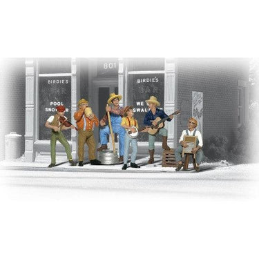 A set of six band members. There’s a guitar player, a jug player, a banjo picker, a washboard strummer, a fiddler and a man strumming a wash tub bass.