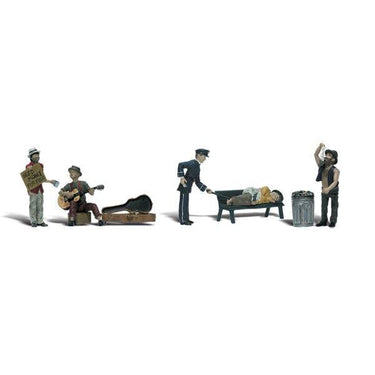 Set includes a policeman preparing to wake a bum as he sleeps on a park bench. A bum searches through the trash, one bum displays a "need money for food" sign and another strums his guitar.