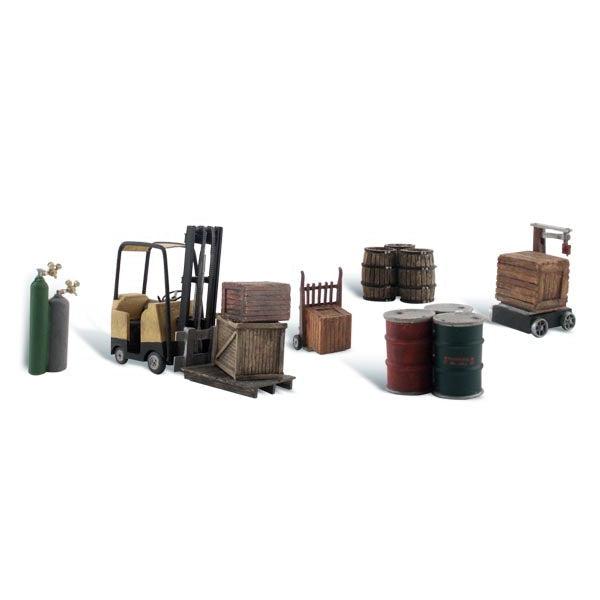 All the usual loading dock items including, crates, a scale, forklift and dolly.