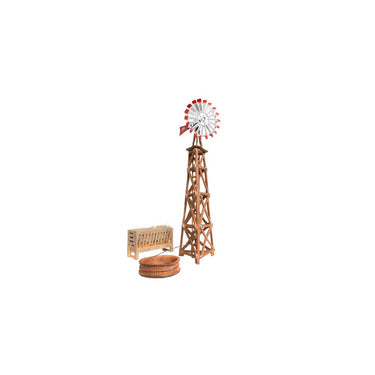 Windmill - HO Scale; - This well-kept Windmill indicates someone is investing in the property. It features a shiny metal turbine that sits high on a tall wooden tower, and a ladder leads up to the turbine for easy maintenance. Accessories include a round stock tank and a hayrack. See photos for footprint.